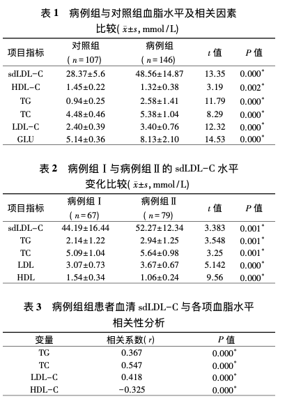 ÆëÆë¹þ¶ûҽѧԺÁ¥ÊôµÚÈýÒ½ÔºµÄÑîÐã¾²µÈ[6]£¬ £¬£¬£¬£¬£¬£¬½«146ÀýT2DM»¼£¨ÆäÖÐÄÐ85Àý£¬ £¬£¬£¬£¬£¬£¬Å®61Àý£»£» £»£»£»£»£» £»ÄêËê30¡«70Ë꣩Öд¿´âT2DM»¼Õß67ÀýΪ²¡Àý×é¢ñ£¬ £¬£¬£¬£¬£¬£¬T2DM¼°²¢·¢Ö¢»¼Õß79ÀýΪ²¡Àý×é¢ò£»£» £»£»£»£»£» £»ÁíÑ¡ÔñͬÆÚ¿µ½¡Ìå¼ìÕß107Ãû×÷Ϊ±ÈÕÕ×é¡£¡£¡£¡£ ¡£Á½×é¾ù¾ÙÐÐsd LDL-C¡¢GLU¡¢TC¡¢TG¡¢LDL-C¡¢HDL-C¼ì²â¡£¡£¡£¡£ ¡£ÊÓ²ìT2DM¼°Æä²¢·¢Ö¢»¼ÕßѪÇåÖÐsdLDL-Cˮƽת±äÇéÐβ¢ÆÊÎöÆäÁÙ´²Ó¦ÓüÛÖµ¡£¡£¡£¡£ ¡£Ñо¿Ð§¹ûÅú×¢£¬ £¬£¬£¬£¬£¬£¬sd LDL-CÔÚT2DM»¼ÕßÖÐÉý¸ßÏÔ×Å£¬ £¬£¬£¬£¬£¬£¬sd LDL-CÓëTG¡¢TC¡¢LDL-C³ÊÕýÏà¹ØÓëHDL-C³Ê¸ºÏà¹Ø¡£¡£¡£¡£ ¡£ÊÓ²ìsd LDL-CµÄת±äÇéÐοÉÓÃÓÚÕ¹ÍûT2DM²¢·¢Ö¢²¡±ä±¬·¢Î£º¦¡£¡£¡£¡£ ¡£