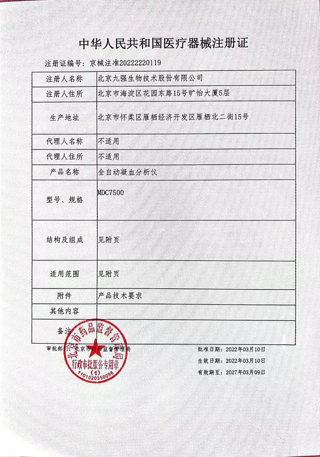尊龙官方生物全自动凝血剖析仪MDC7500顺遂取得北京市药品监视管理局揭晓的《医疗器械注册证》。。。。。