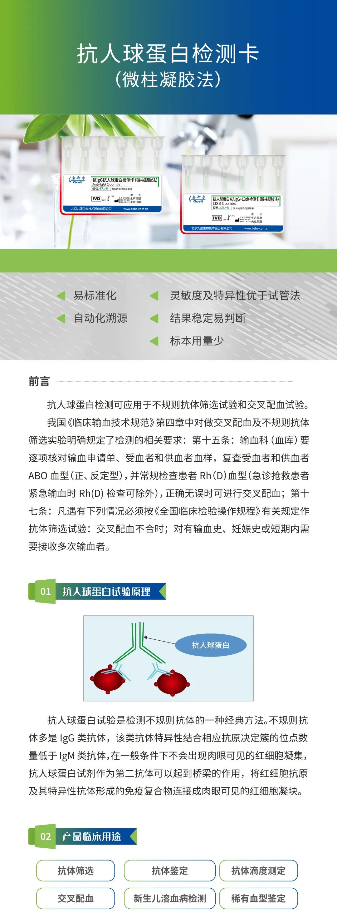 本试剂盒用于间接抗人球卵白试验,,,,,,,,用于不规则抗体筛查和交织配血,,,,,,,,仅用于临床检测,,,,,,,,不必于血源筛查。。。。。。。。