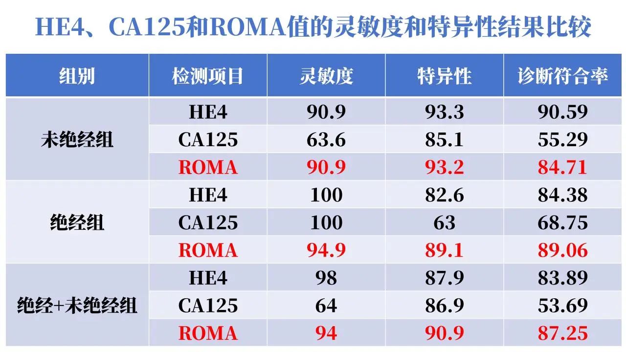 ROMA(卵巢恶性肿瘤危害判断):辅助评估盆腔肿块患者为卵巢癌的危害系数,,,,,CA125和HE4的血清浓度与患者绝经状态相团结的一个评估模子,,,,,特殊是关于提高早期卵巢癌的检出率更有意义。。。。。。