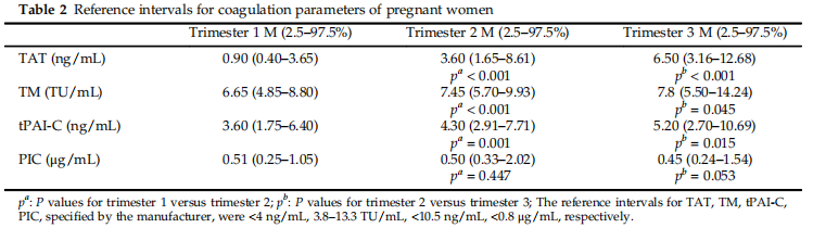 ÏÖÔÚ¾ø´ó´ó¶¼ÊµÑéÊÒ¸ø³öµÄÄýѪָ±ê²Î¿¼¹æÄ£¶¼ÊÇ·ÇÔÐÆÚºÍͨË×ÈËȺ£¬£¬£¬£¬£¬£¬£¬£¬¶øÈÑÉïÆÚÔи¾µÄѪҺÊÇ´¦ÓÚÐÄÀíÐԵĸßÄý״̬£¬£¬£¬£¬£¬£¬£¬£¬¹ÊÔи¾²»¿É²ÎÕÕ·ÇÈÑÉïÈËȺÄýѪָ±êµÄ²Î¿¼Çø¼ä£¬£¬£¬£¬£¬£¬£¬£¬ÔÚ½«ÑªË¨ËÄÏîÖ¸±êÆÕ±éÓÃÓÚÈÑÉïʱ´úÓëѪ˨ÐÔ¼²²¡µÄÁÙ´²ÆÀ¹À֮ǰ£¬£¬£¬£¬£¬£¬£¬£¬ÓÐÐëҪΪ¿µ½¡Ôвú¸¾½¨Éè²Î¿¼Çø¼ä¡£¡£¡£¡£¡£¡£±±¾©´óѧµÚÈýÒ½ÔºÕÅæµ¾²µÈÏÈÉúÔÚ¡¶THE JOURNAL OF Obstetrics ancGynaecology Research¡·½ÒÏþµÄѧÊõÂÛÎĶÔÖйúÔи¾ÈÑÉïÆÚTAT¡¢TM¡¢t-PAIC¡¢PICµÄת±ä¼°¿µ½¡Ôвú¸¾ÈÑÉïÆÚÌØ¶¨²Î¿¼¹æÄ£¾ÙÐÐÁËÑо¿¡£¡£¡£¡£¡£¡£Ñо¿ÄÉÈ뻪±±µØÇø190Àý¿µ½¡Ôвú¸¾£¬£¬£¬£¬£¬£¬£¬£¬½ÓÄÉ»¯Ñ§·¢¹â·¨¼ì²âTAT¡¢TM¡¢t-PAICºÍPICˮƽ£¬£¬£¬£¬£¬£¬£¬£¬ÔÚ2.5%ºÍ97.5%µÄÂþÑܹæÄ£½¨ÉèÁËÈÑÉïÆÚÌØ¶¨²Î¿¼Çø¼ä£¨Ð§¹û¼û±í2£©¡£¡£¡£¡£¡£¡£×îÖÕÑо¿Åú×¢£¬£¬£¬£¬£¬£¬£¬£¬TAT¡¢TM¡¢t-PAICµÄˮƽ´ÓÔÐÔçÆÚ(ÈÑÉï5-12ÖÜ)µ½ÔÐÍíÆÚ(ÈÑÉï28-40ÖÜ)ÏÔ×ÅÔöÌí£¬£¬£¬£¬£¬£¬£¬£¬¶øPICµÄˮƽ²¢Ã»ÓÐËæ×ÅÔÐÖܵÄÔöÌí¶ø±¬·¢ÏÔÖø×ª±ä¡£¡£¡£¡£¡£¡£