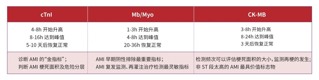 心脏细胞胞质中含量富厚,,,,,,具有高度心脏特异性,,,,,,AMI爆发后20min最先升高,,,,,,1~3h内可以在血中检测出,,,,,,4~6h抵达峰值,,,,,,20~30h内血浆中的浓度恢复正常水平,,,,,,其释放量与心肌损伤规模成正比。。。。。。